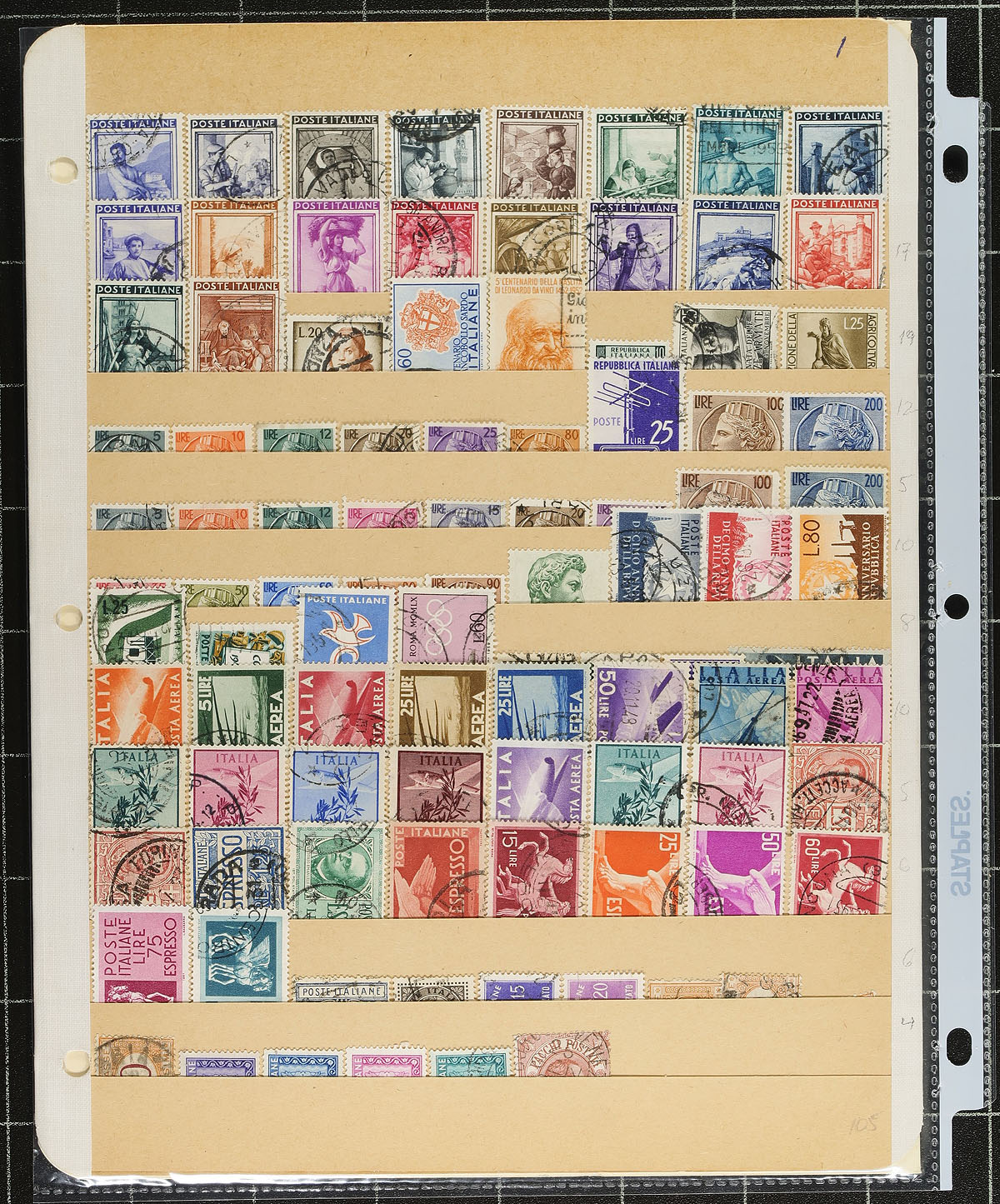 An accumulation with just over a century of used stamps, including lots of 19th and early 20th century issues (including the 1911 "Union of Italy" set), with a bit of airmail. Condition looks better than normal. A bit of duplication is to be expected. Fairly recently the owner catalogued this lot, by Scott, at over US$1300.00 ($1755.00 CDN). Estimate =