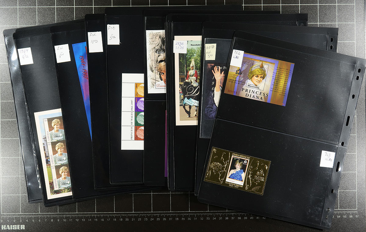 Princess Diana Thematic collection in a small carton. A smaller section of the 1981 "Royal Wedding" than are normally seen (but includes the better North Korea issues), with a sampling of "21st birthday" sets. The bulk of the material is the material produced after her passing (which was produced in much smaller quantities but still had enormous original cost). Includes stamps, souvenir sheets, first day covers (including a section from just Belize). Hundreds of items, mostly mint, never hinged. The perfect lot for the modern-day monarchist. Estimate =