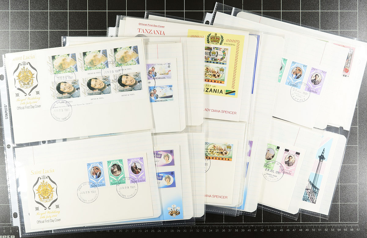 Princess Diana Thematic collection in a small carton. A smaller section of the 1981 "Royal Wedding" than are normally seen (but includes the better North Korea issues), with a sampling of "21st birthday" sets. The bulk of the material is the material produced after her passing (which was produced in much smaller quantities but still had enormous original cost). Includes stamps, souvenir sheets, first day covers (including a section from just Belize). Hundreds of items, mostly mint, never hinged. The perfect lot for the modern-day monarchist. Estimate =