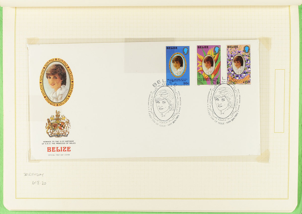 Princess Diana Thematic collection in a small carton. A smaller section of the 1981 "Royal Wedding" than are normally seen (but includes the better North Korea issues), with a sampling of "21st birthday" sets. The bulk of the material is the material produced after her passing (which was produced in much smaller quantities but still had enormous original cost). Includes stamps, souvenir sheets, first day covers (including a section from just Belize). Hundreds of items, mostly mint, never hinged. The perfect lot for the modern-day monarchist. Estimate =