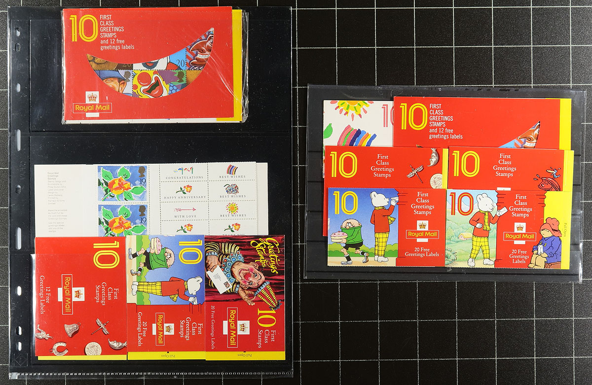 Attractive 1990's-strong mint lot, including 11 "Greetings Stamps" booklets (bit of duplication) and three "Smilers" panes (these from 2008) resulting in 170 "First Class" stamps. There are two small bundles of mint sets, which are the stamp and card portion of presentation packs (face £100.00). All are mint, never hinged. No Machins. Total Face Value £389.00 ($719.65 CDN). Huge catalogue value. Estimate =