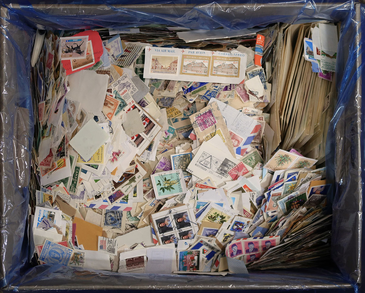 Some album pages and glassine envelopes line the bottom of this banker’s box, but otherwise it is thousands and thousands of "off and on" paper, mostly used material from all across philately. Each handful turns up different countries, with material going back to the early 20th century (maybe earlier, we don’t know) and up to just a few years ago. A true charitable mix, most has never been handled by collectors before. This will keep you busy for a while. Estimate =