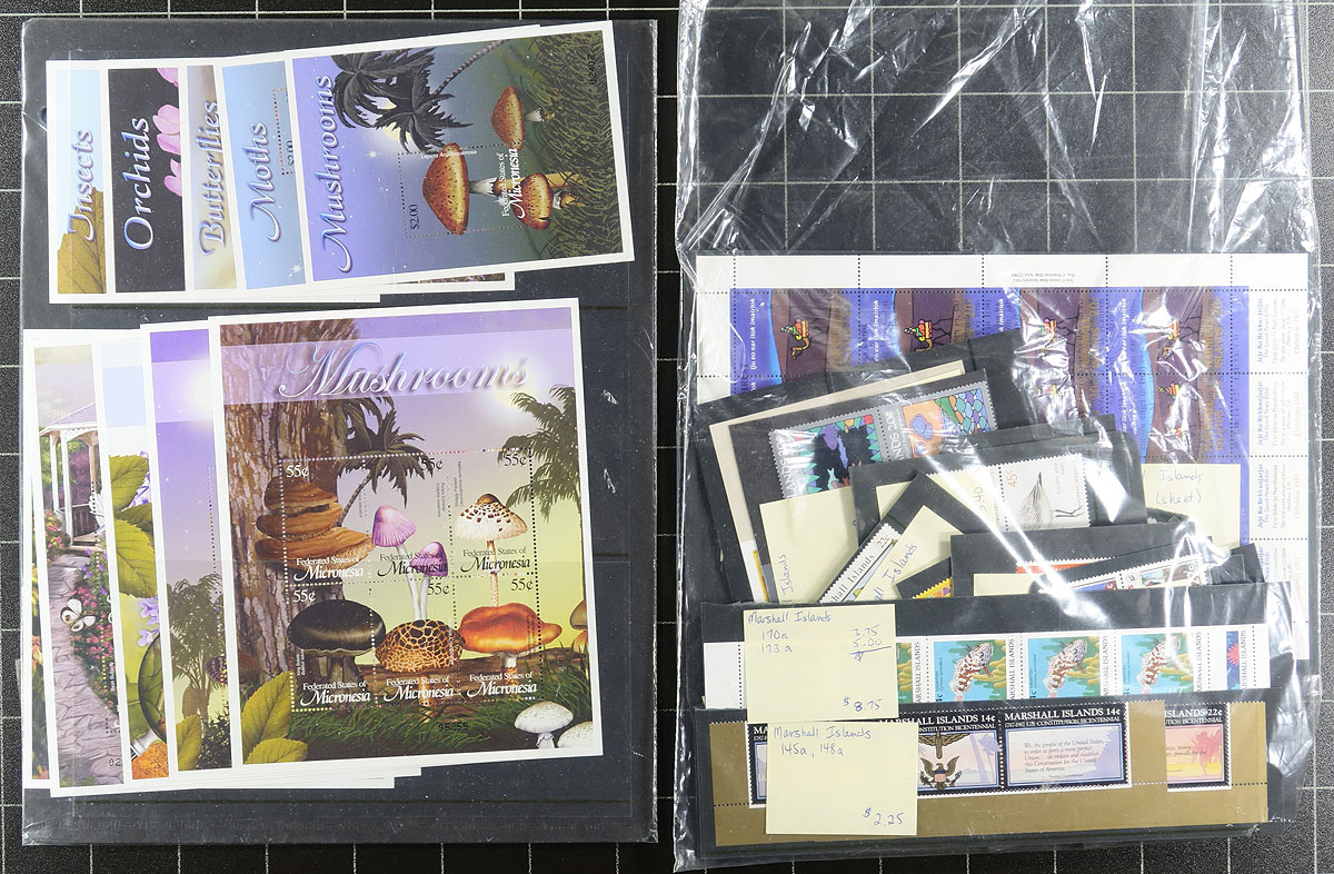 A mostly mint collection (with duplicates) from Palau, Marshall Islands and Micronesia, all seem to be 1980's-1990's issues, including singles, sets, souvenir sheets, panes and a booklet or two. Well over $1000.00 catalogue value here, indicating that the original face value is at least US$300.00. Great topical interest for oceanic themes, WWII, aircraft, etc. A cheap way to build a pre-Independence collection from these islands. Estimate =
