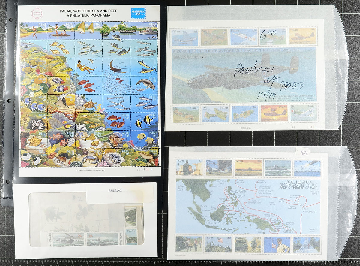 A mostly mint collection (with duplicates) from Palau, Marshall Islands and Micronesia, all seem to be 1980's-1990's issues, including singles, sets, souvenir sheets, panes and a booklet or two. Well over $1000.00 catalogue value here, indicating that the original face value is at least US$300.00. Great topical interest for oceanic themes, WWII, aircraft, etc. A cheap way to build a pre-Independence collection from these islands. Estimate =