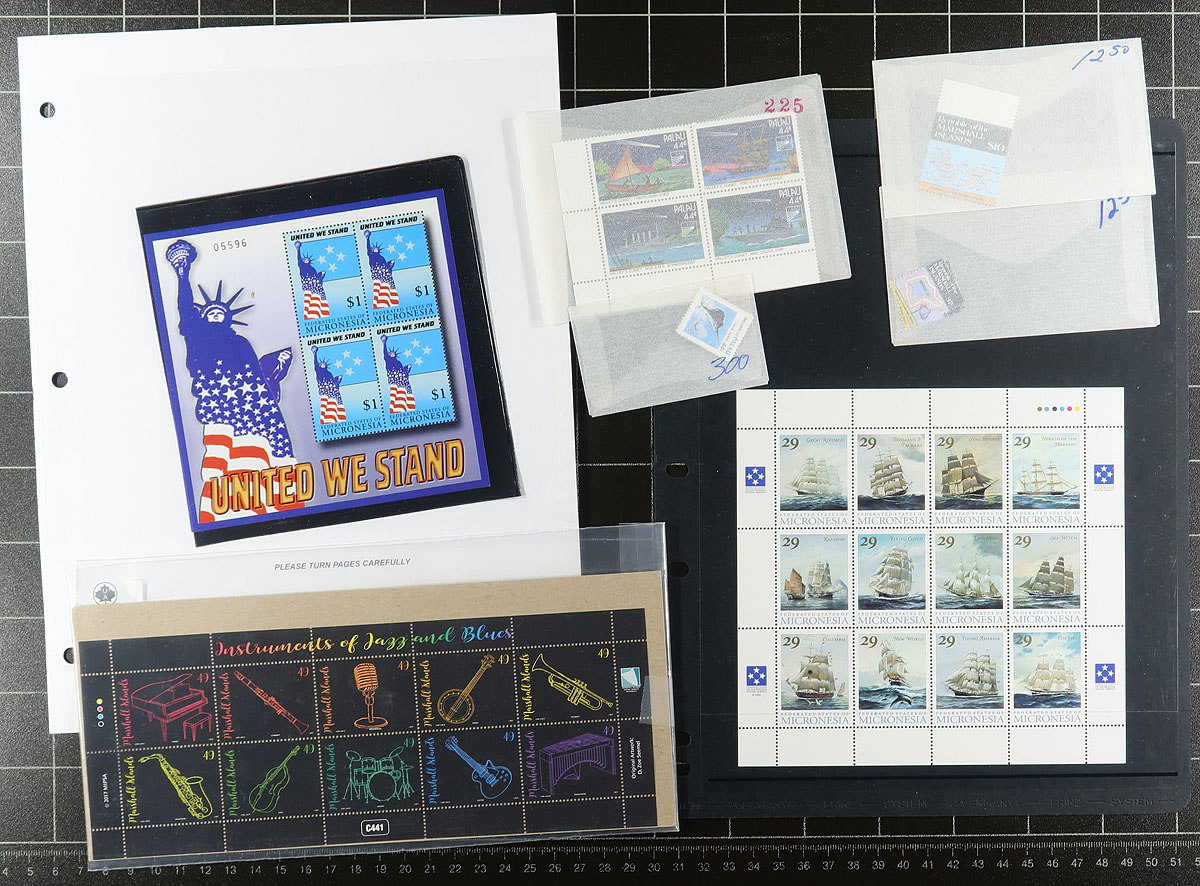 A mostly mint collection (with duplicates) from Palau, Marshall Islands and Micronesia, all seem to be 1980's-1990's issues, including singles, sets, souvenir sheets, panes and a booklet or two. Well over $1000.00 catalogue value here, indicating that the original face value is at least US$300.00. Great topical interest for oceanic themes, WWII, aircraft, etc. A cheap way to build a pre-Independence collection from these islands. Estimate =