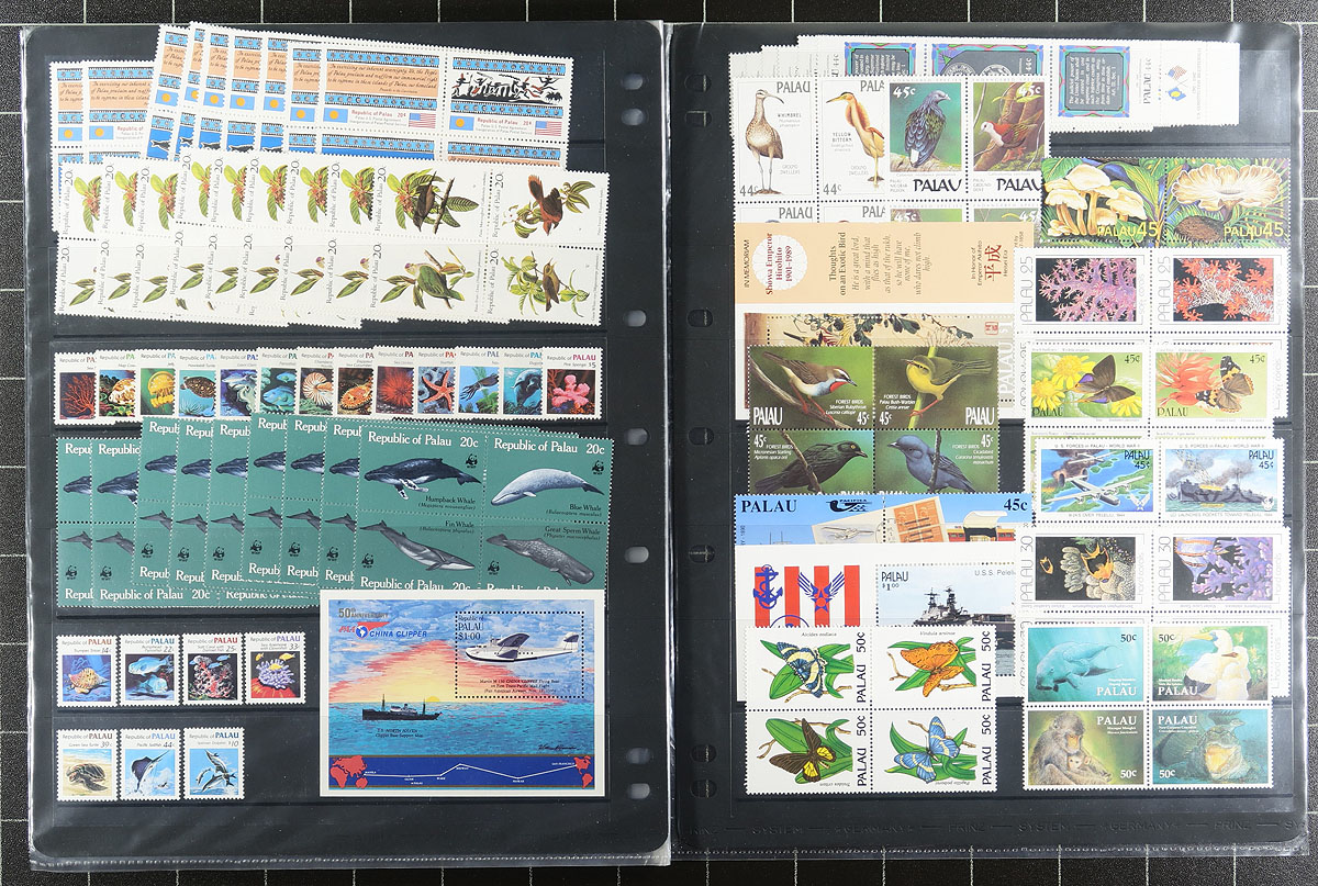 A mostly mint collection (with duplicates) from Palau, Marshall Islands and Micronesia, all seem to be 1980's-1990's issues, including singles, sets, souvenir sheets, panes and a booklet or two. Well over $1000.00 catalogue value here, indicating that the original face value is at least US$300.00. Great topical interest for oceanic themes, WWII, aircraft, etc. A cheap way to build a pre-Independence collection from these islands. Estimate =