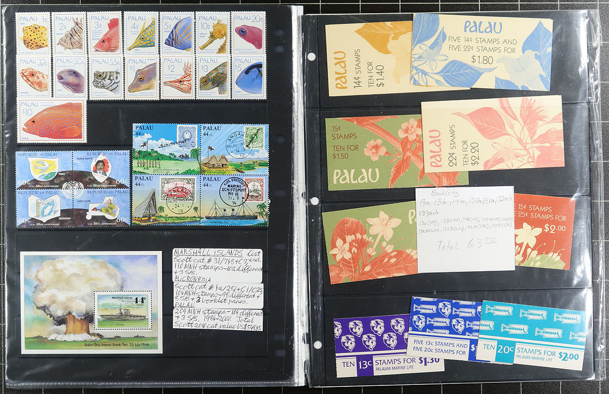 A mostly mint collection (with duplicates) from Palau, Marshall Islands and Micronesia, all seem to be 1980's-1990's issues, including singles, sets, souvenir sheets, panes and a booklet or two. Well over $1000.00 catalogue value here, indicating that the original face value is at least US$300.00. Great topical interest for oceanic themes, WWII, aircraft, etc. A cheap way to build a pre-Independence collection from these islands. Estimate =