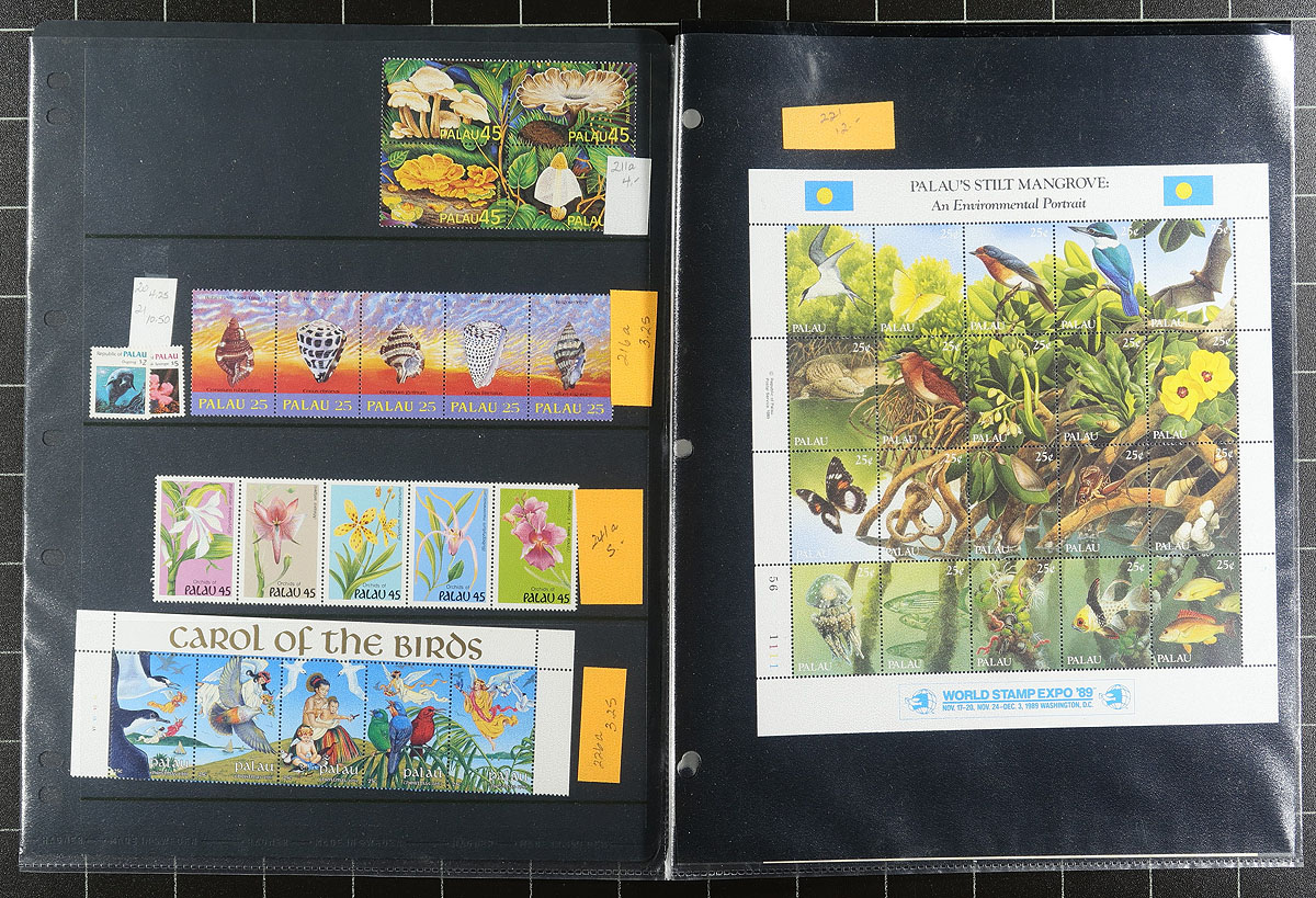 A mostly mint collection (with duplicates) from Palau, Marshall Islands and Micronesia, all seem to be 1980's-1990's issues, including singles, sets, souvenir sheets, panes and a booklet or two. Well over $1000.00 catalogue value here, indicating that the original face value is at least US$300.00. Great topical interest for oceanic themes, WWII, aircraft, etc. A cheap way to build a pre-Independence collection from these islands. Estimate =