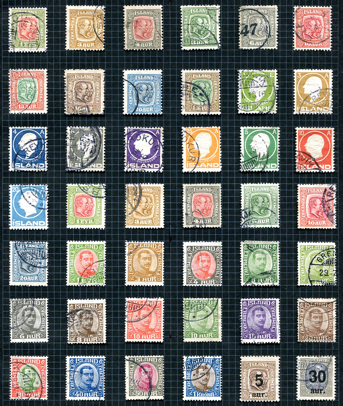 A black page of 42 different used early 20th century issues (one with a revenue cancel), with lots of key values and most of the "Sigurdsson" set. As the "two kings" set is a bit light a complete set of #99-107 is included, which will result in a couple of duplicates. A nice, clean offering. Owner’s 2023 Scott US$677.00 =