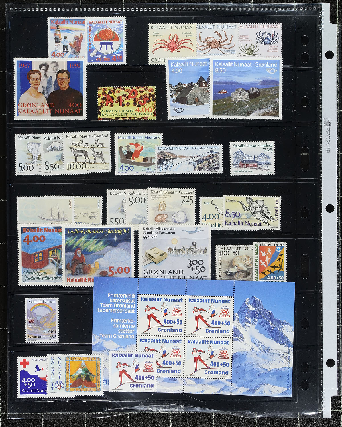 All late 20th century and all mint never hinged, with a selection from each country. The Denmark consists of 8 different complete booklets. Faroes is represented by 6 complete sets in panes of 20, with topical appeal for Bird, Children, Animal, Europa collectors. The Greenland is a nearly complete run from 1987-1994, with a few semi-postals. An attractively mounted group that had significant original cost. 2023 Scott US$635.35 =