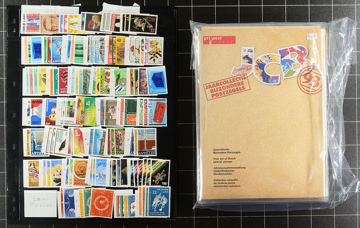 Mint assortment of year (1990-1993), presentation (1988-2002) and mini-sheet (2012) packs, plus some sets and singles and more mini-sheets on stockpages and some complete booklets. There is some Netherland-Indies (with a sextet of early postage due colour trials, mixed condition) and Suriname. Mostly never hinged, few faults to be expected. Estimate =