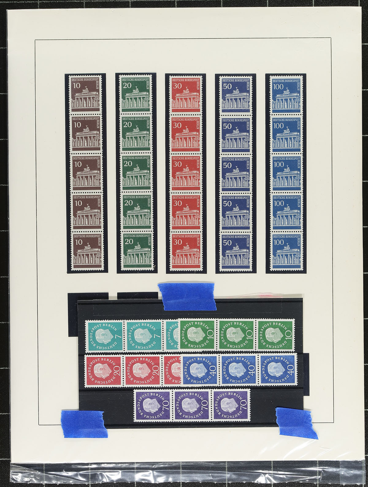 Four groups of mint coils (mainly in strips with control numbers), the Berlin issues being the strongest, including the "Heuss" issue, Brandenburg Gates, Medieval buildings (and some other singles). The West German coils are from the 1988-1991 definitives. All are never hinged. Not listed in Scott, but are in Michel (catalogued several years ago) at €506.00 in Canadian Dollars =