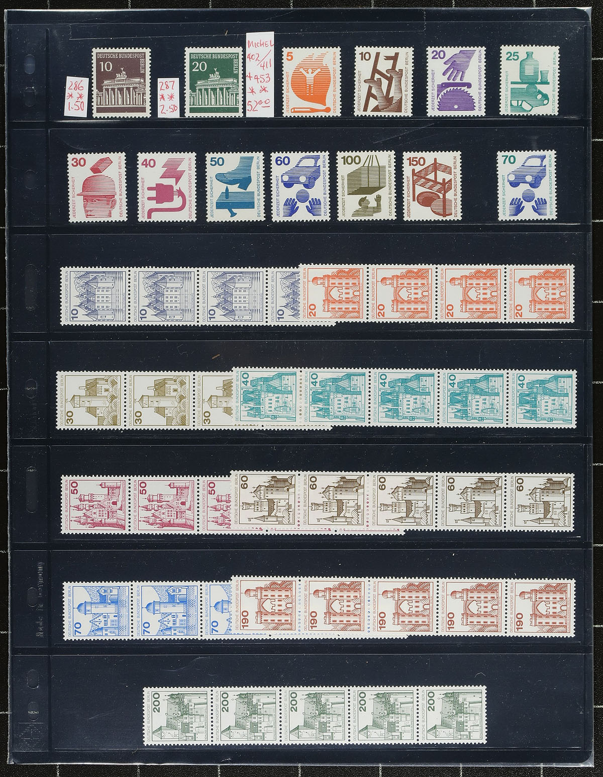 Four groups of mint coils (mainly in strips with control numbers), the Berlin issues being the strongest, including the "Heuss" issue, Brandenburg Gates, Medieval buildings (and some other singles). The West German coils are from the 1988-1991 definitives. All are never hinged. Not listed in Scott, but are in Michel (catalogued several years ago) at €506.00 in Canadian Dollars =