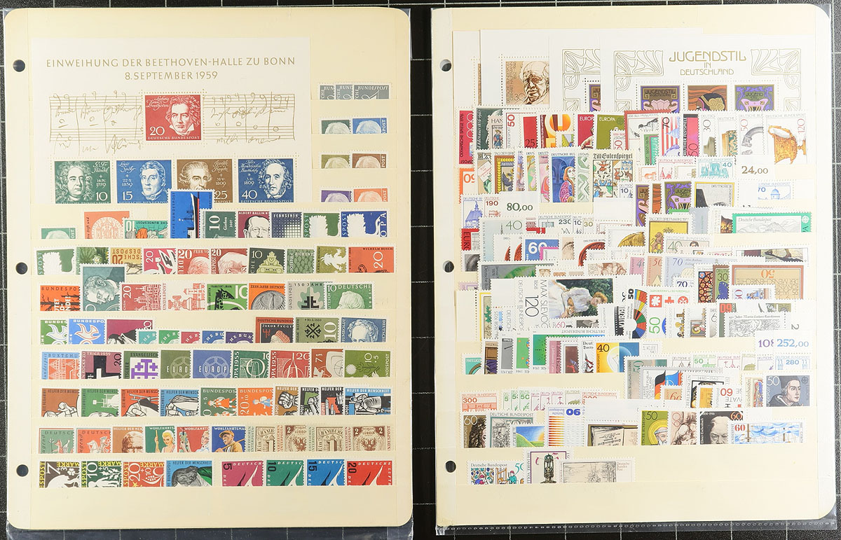 Mint holding #1: A mix of dealer offerings from "102" cards up to full stockpages, ready to go for the collector or reseller. The "102" cards are mostly 1955 to 2000, with recent catalogue values totaling over US$700.00. We also saw a card with 20 different mint singles with control numbers on the back and a couple of pages that include sets and souvenir sheets. Condition is good overall, most are never hinged. Strength is West Germany, with some semi-postals and some Berlin and maybe a hint of DDR. Estimate =