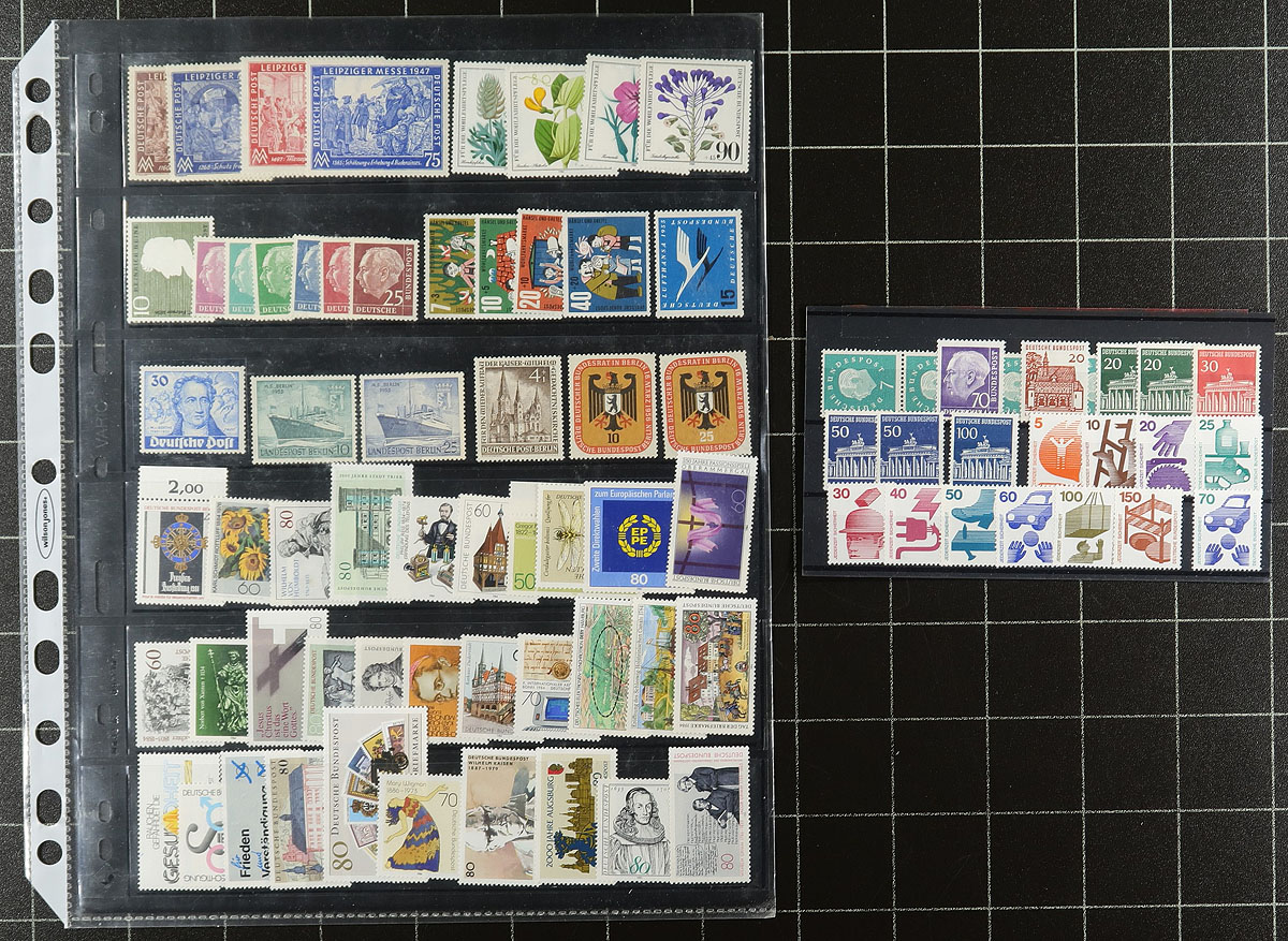 Mint holding #1: A mix of dealer offerings from "102" cards up to full stockpages, ready to go for the collector or reseller. The "102" cards are mostly 1955 to 2000, with recent catalogue values totaling over US$700.00. We also saw a card with 20 different mint singles with control numbers on the back and a couple of pages that include sets and souvenir sheets. Condition is good overall, most are never hinged. Strength is West Germany, with some semi-postals and some Berlin and maybe a hint of DDR. Estimate =
