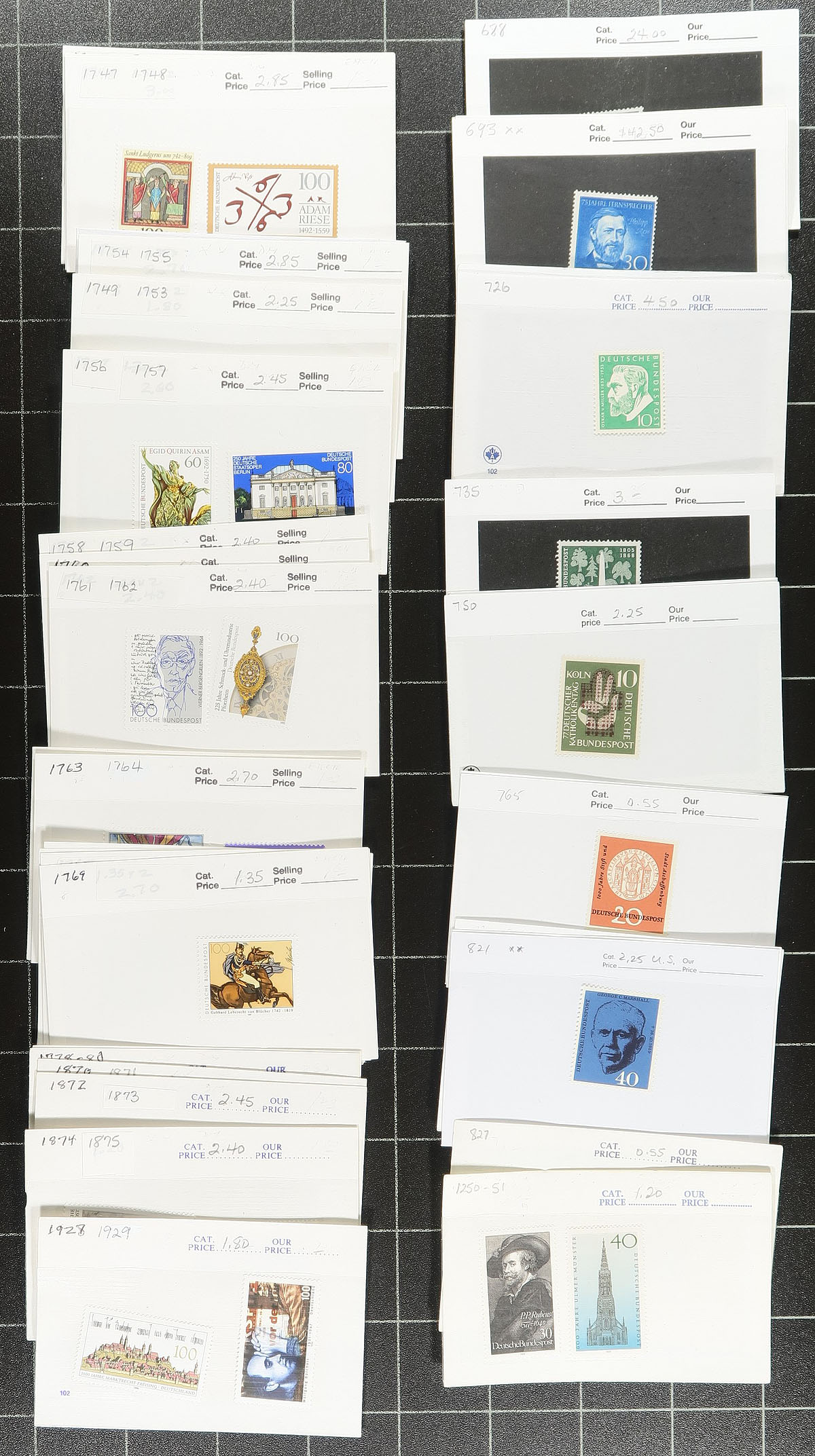 Mint holding #1: A mix of dealer offerings from "102" cards up to full stockpages, ready to go for the collector or reseller. The "102" cards are mostly 1955 to 2000, with recent catalogue values totaling over US$700.00. We also saw a card with 20 different mint singles with control numbers on the back and a couple of pages that include sets and souvenir sheets. Condition is good overall, most are never hinged. Strength is West Germany, with some semi-postals and some Berlin and maybe a hint of DDR. Estimate =