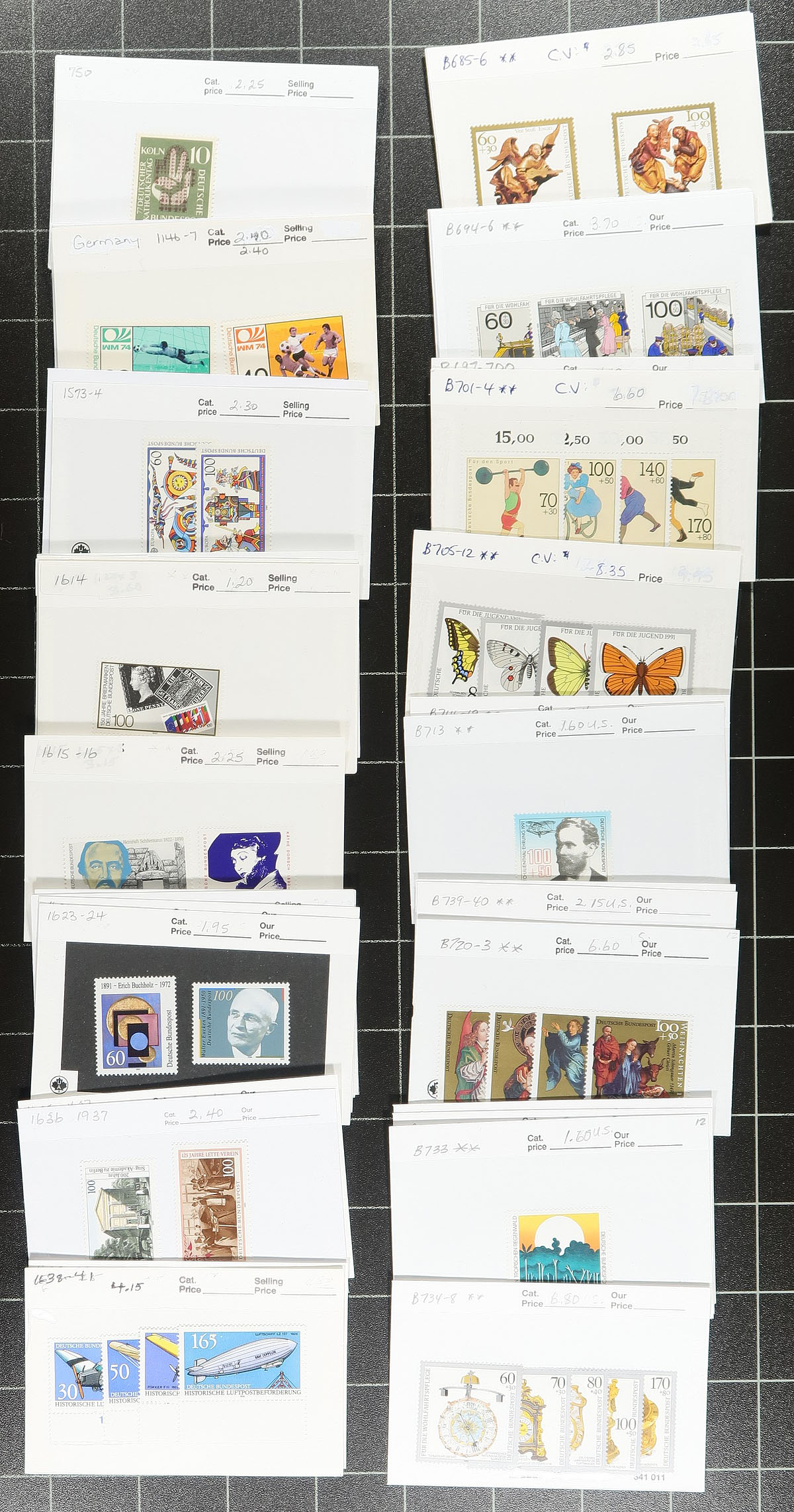 Mint holding #1: A mix of dealer offerings from "102" cards up to full stockpages, ready to go for the collector or reseller. The "102" cards are mostly 1955 to 2000, with recent catalogue values totaling over US$700.00. We also saw a card with 20 different mint singles with control numbers on the back and a couple of pages that include sets and souvenir sheets. Condition is good overall, most are never hinged. Strength is West Germany, with some semi-postals and some Berlin and maybe a hint of DDR. Estimate =