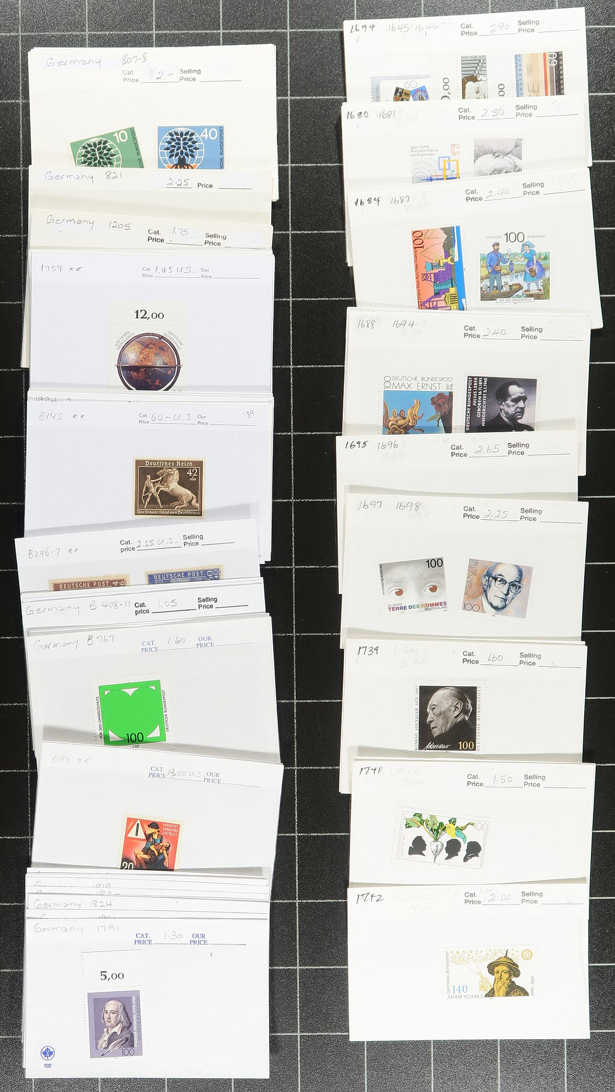 Mint holding #1: A mix of dealer offerings from "102" cards up to full stockpages, ready to go for the collector or reseller. The "102" cards are mostly 1955 to 2000, with recent catalogue values totaling over US$700.00. We also saw a card with 20 different mint singles with control numbers on the back and a couple of pages that include sets and souvenir sheets. Condition is good overall, most are never hinged. Strength is West Germany, with some semi-postals and some Berlin and maybe a hint of DDR. Estimate =