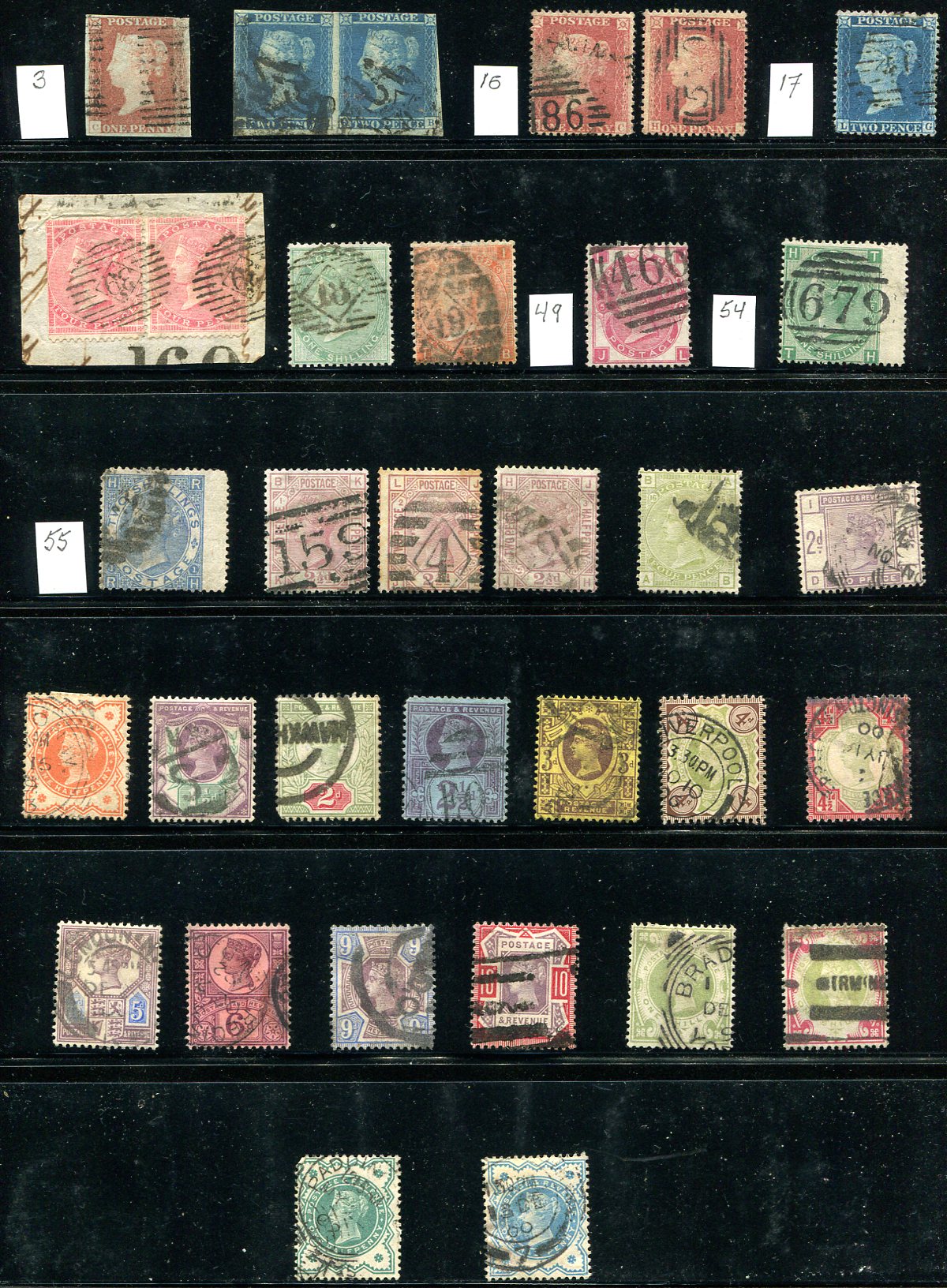 A page of mostly different Queen Victoria stamps, including pairs of #4 and #26, with better singles of up to $350.00 catalogue values. Includes some different plate numbers, a few nice cancels. Condition is mixed, as is often the case (the 2/- #55 is not counted). An attractive page. 2024 Scott US$1611.65 =