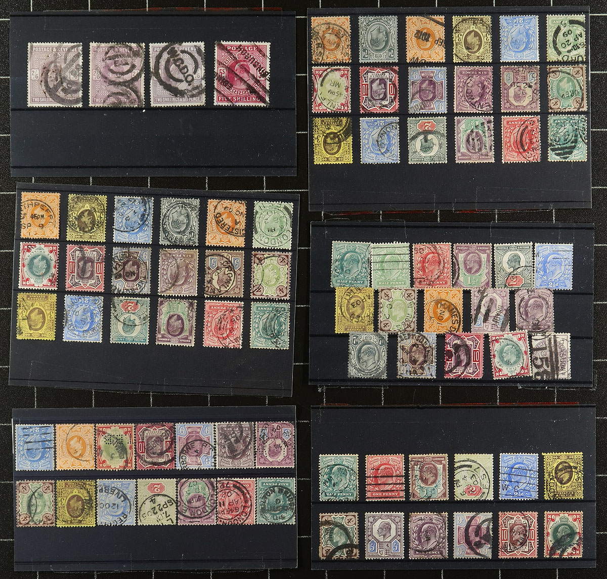 Study Group. This collector was at the first stage of building a used King Edward VII collection with all the various printings and shades. This involved buying everything he could put his hands on, including random sets and singles (up to 5/-) as well as existing colour shade studies. They are all here and rather than break them up, we will let someone else carry on with this work. Conservate Scott catalogue value US$2000.00 =
