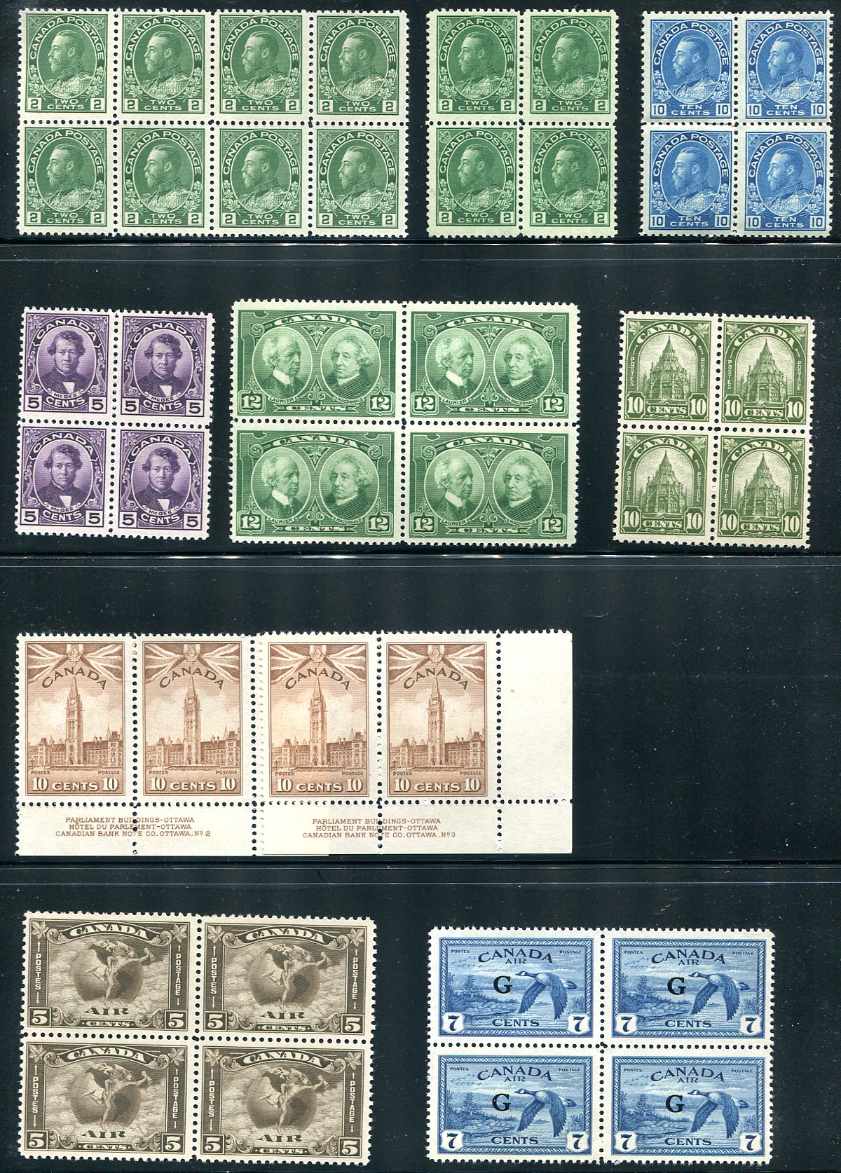 Mint multiples of various sizes including Admirals, the 2c green in a block of 4 (hinged) and 8 (never hinged) and the 10c blue (gum disturbance from poor storage, counted as hinged). The balance of the lot is never hinged, with the 10c Library, plate pairs of the 10c Peace Tower and two airmail issues. Owner's 2024 Scott US$1359.00 =