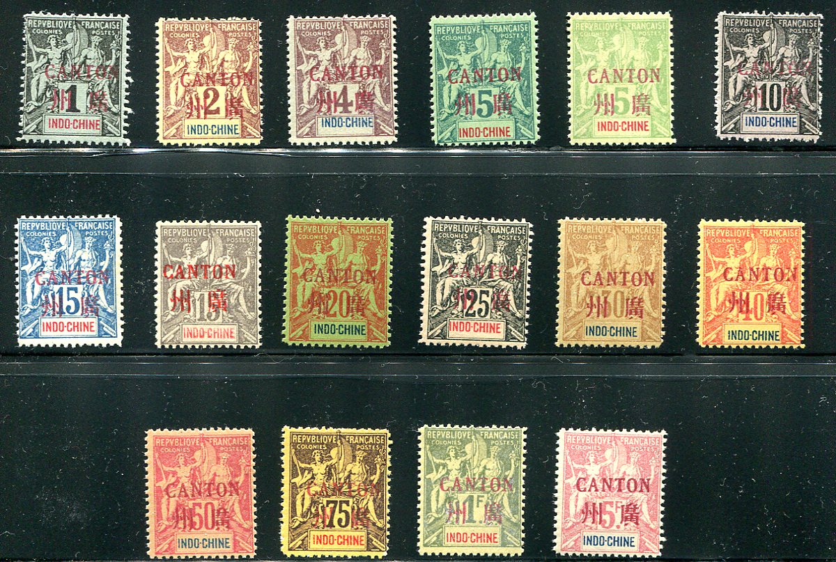 The complete first set from 1901, with the French Indo-China "Navigation and Commerce" set, overprinted "Canton" in two languages. With both shades of the 5c green (#2A, #3) and the 5 franc #14). Total of 16 mint stamps, with light hinging or gum disturbance. Far nicer than usually seen. 2025 Scott US$1,100.00 =