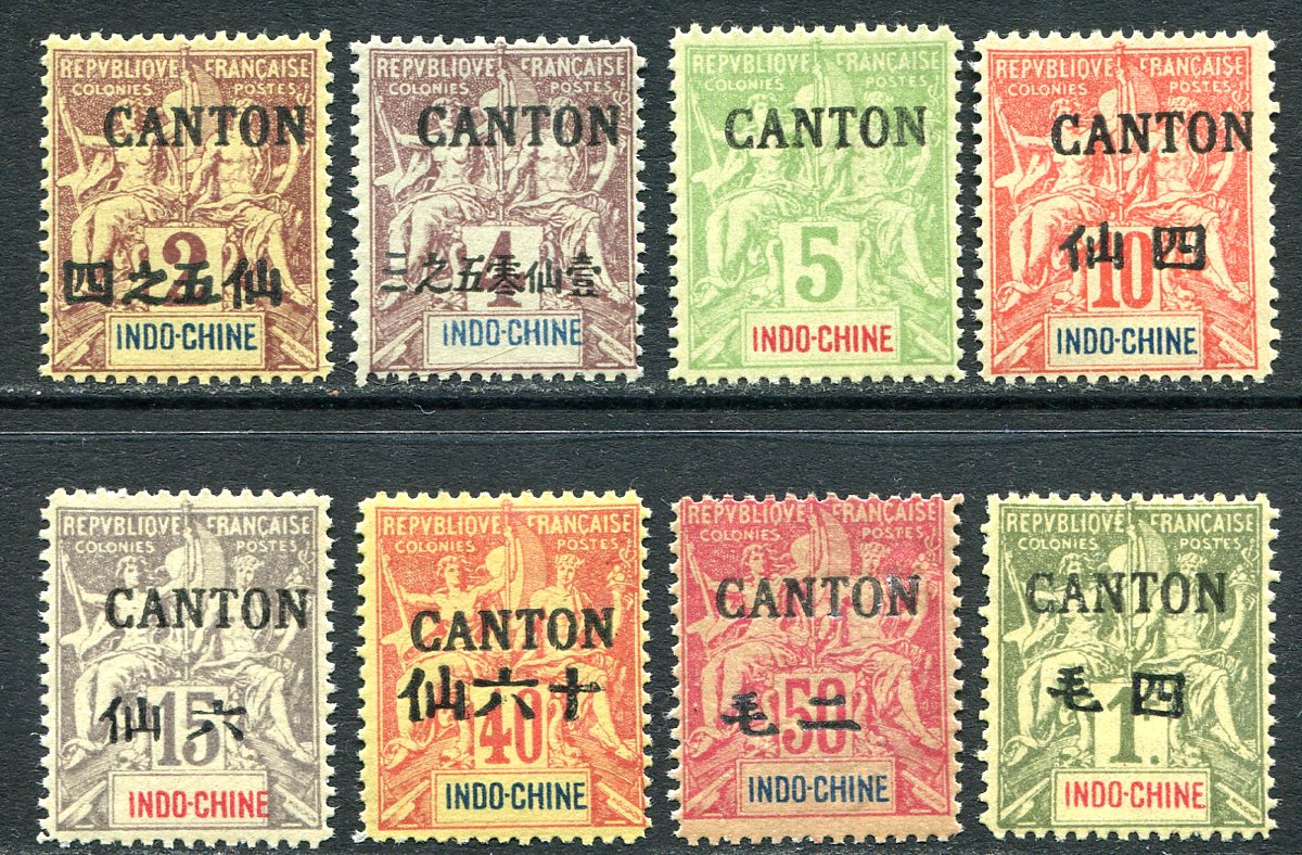 A nice selection of seven values (up to 1 franc) from the 1903 black "Canton" overprints on the French Indo-China "Navigation and Commerce" set. #16-20, and the good #25, #26 and #29. The 5c green does not have the lower part of the overprint (which restates the stamp’s denomination), mentioned in the Scott footnote, but not priced. Fresh mint, with clear gum. 2025 Scott catalogue value US$497.25 =