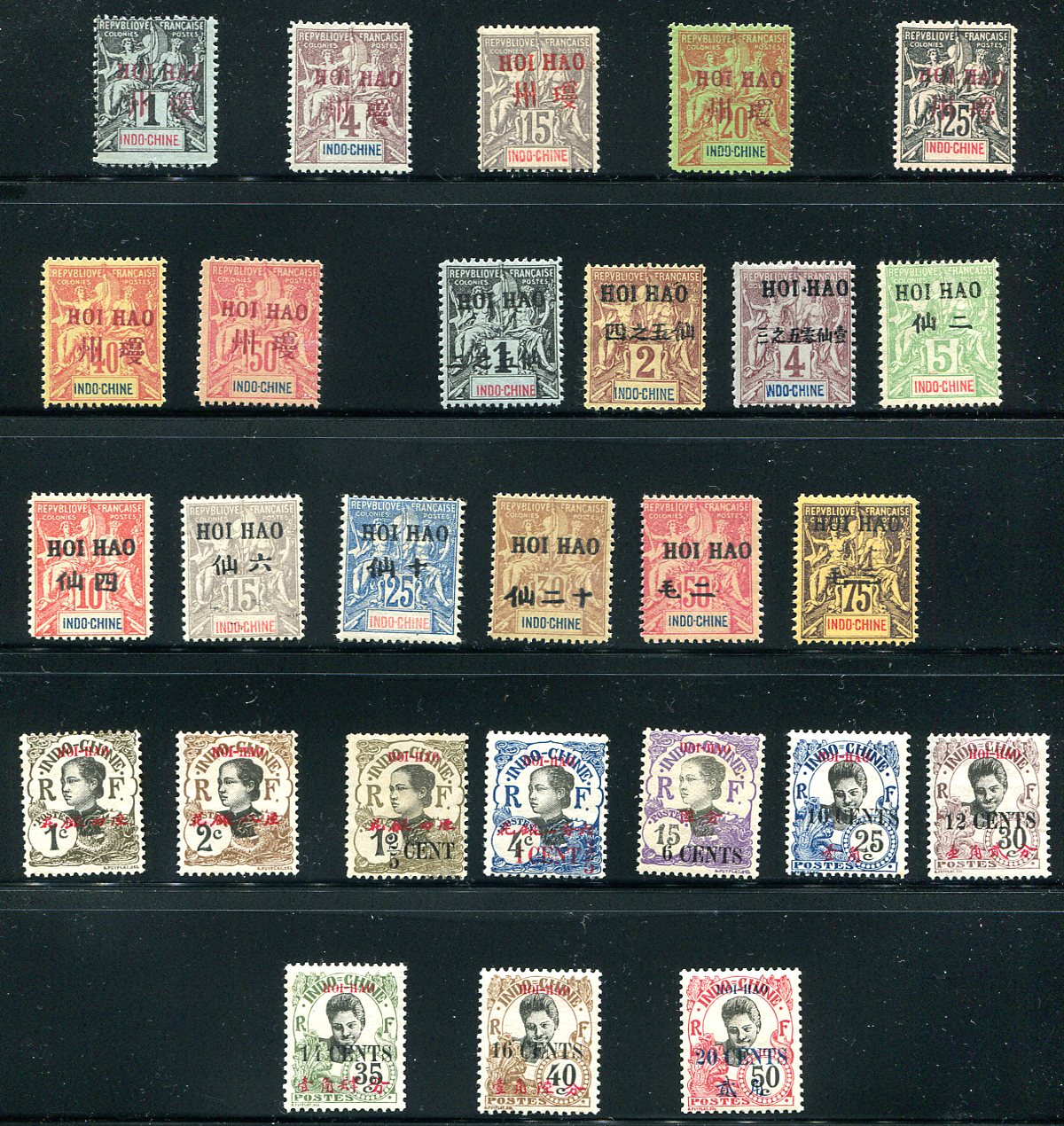 A page with 27 different mint, overprinted issues of both Franch Indo-China and Indo-China issues. Starts with some "Navigation and Commerce" with red or black overprints, noting #11, #12, #27, #29 and ends with an assortment of red, black and revalued overprints on 1908-1919 issues. All with great appearance, and very clean backs (one has a hinge remnant). 2025 Scott US$349.35 =