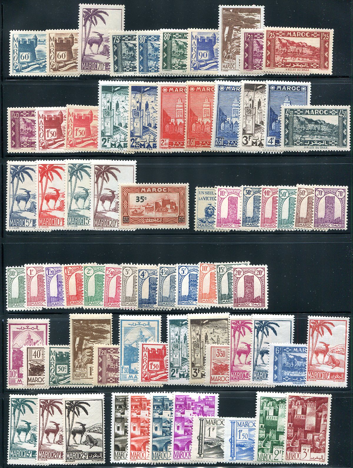 Over 200 consecutive mint hinged regular issues from 1918 to 1953. Starts with the post-war "Tangier" overprints, and includes many sets, some with up to 30 stamps and a few revalued. Great French colonial and North Africa themed issues. 2024 Scott US$545.60 =