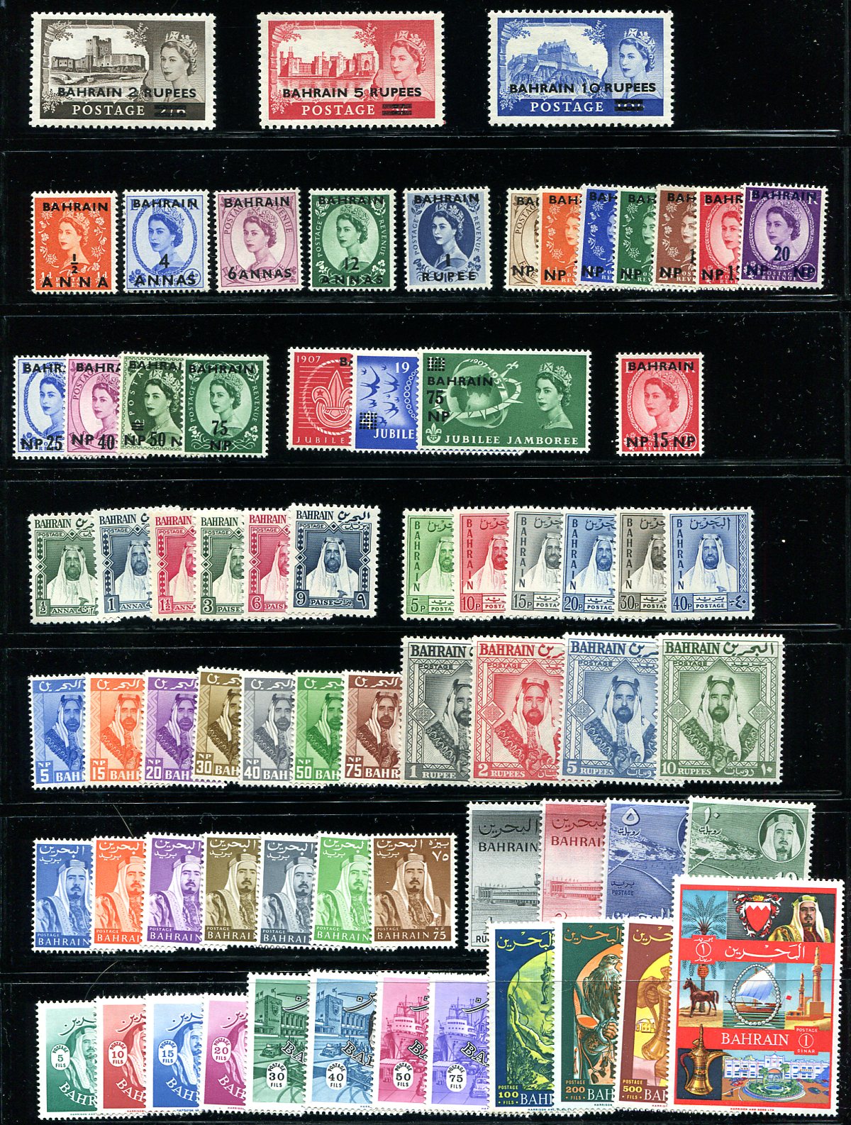 A complete documentation of this country’s philatelic journey from the last King George VI overprinted India stamps, through the overprints on Great Britain stamps (with values to 10R) and finishing with the first Bahrain Postal Administration issue of 1966. Includes both of the Scott footnoted "Sheik" local issues. Mint, most are hinged (a few are never hinged). A popular former British colony on the Arabian Peninsula. 2024 Scott US$658.10 =