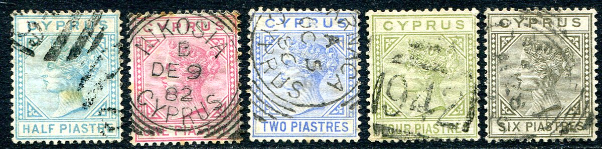 A complete 1881 Queen Victoria "Keyplate" used set of five with the "CC" watermark. Two have "numeral" cancels, and the remaining three have squared circle cancels. A very striking set. 2024 Scott US$952.50 =