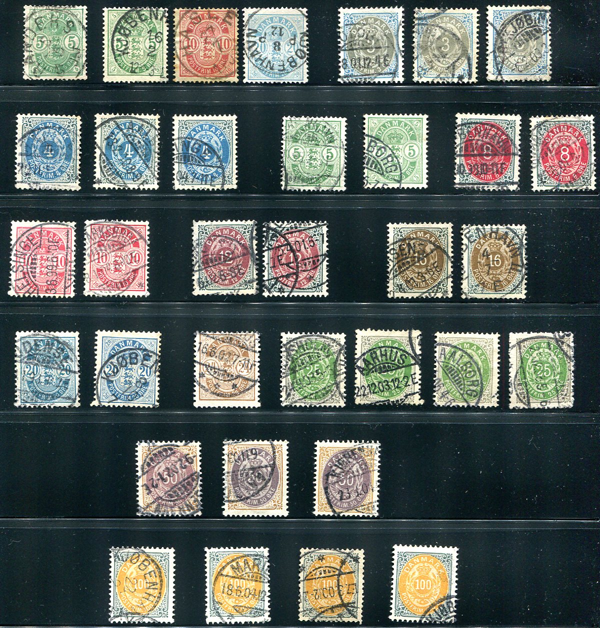 A beautiful page of used late-19th century Danish "Arms" and "Numeral" issues. Starts strong with the "small corner number" 5o (#35), and then has a nice run of variants, including different watermarks and inverted frames. And don’t forget the many readable cancels. Additional key stamps are inverted frame #50c, #52c. 2024 Scott US$718.55 =