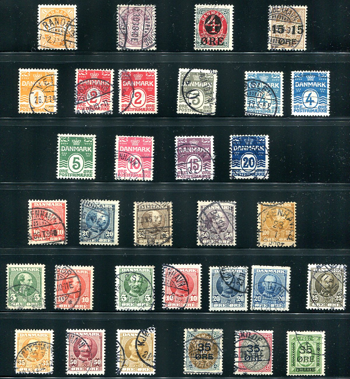 An early-20th century page with a used selection of "Numerals" (with the good perforation on the 4o (#60a)), the complete King Christian IX issue (including #68-69) finishing with the complete trio of revalued issues of 1912 (#79-81). Solid condition throughout, with many nice cancels. 2024 Scott US$560.70 =
