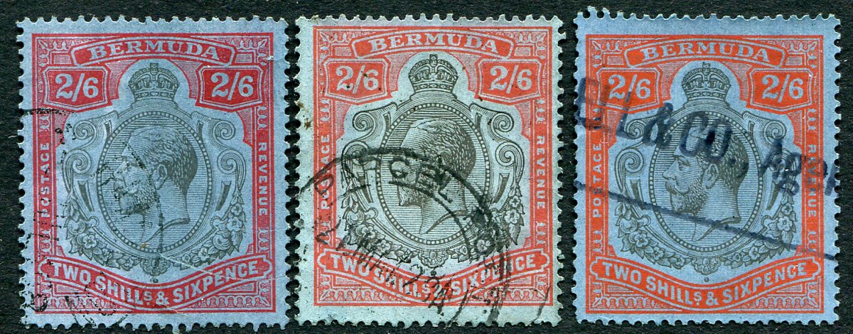 A used trio of the three Scott-listed variants of the King George V 2/6 "Keyplate" issue. #95 has a partial "Hamilton" CDS cancel, the key "pale orange vermillion" shade (#95a) has a "Parcel Post" CDS and the deep vermillion shade (#95b) has a revenue cancel and is not counted. 2024 Scott US$3375.00 =