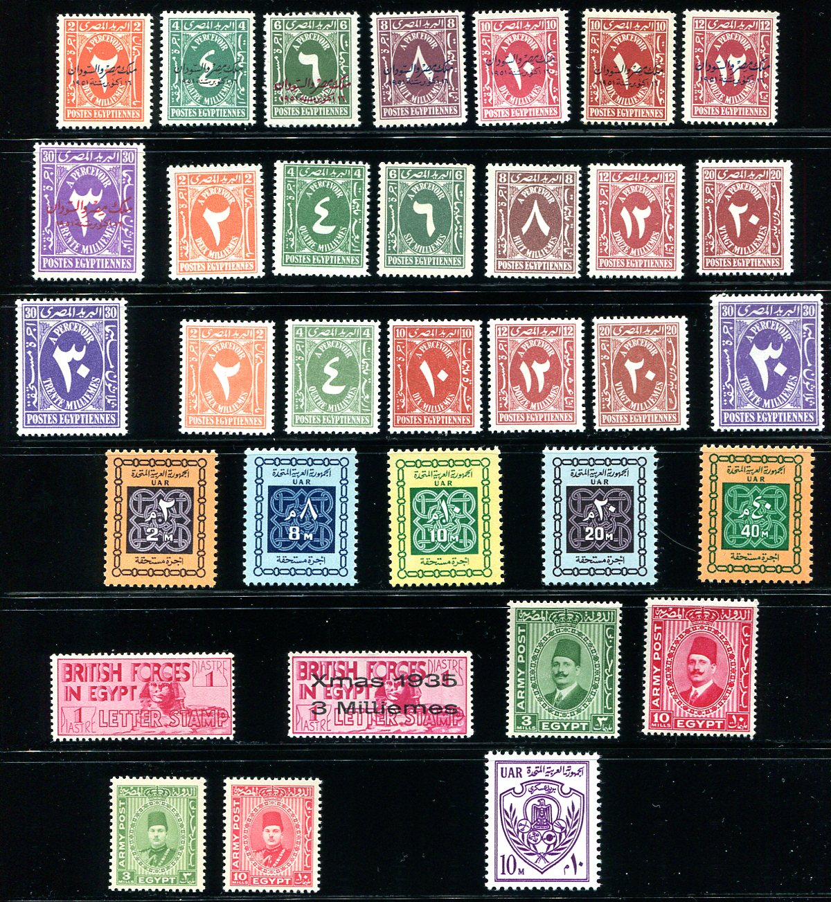 Mint postage dues and military issues on two pages. The postage dues are very complete, but many of the early issues have heavy hinging, a couple with thins. There is a couple of colour shades, a reversed overprint, with seven various Military issues, including the red Sphinx issue and the Christmas 1935 overprint. Not often seen material. 2024 Scott US$1585.30 =