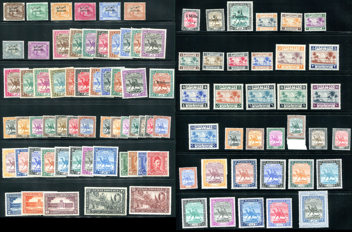 The complete first 50 years of Sudanese stamps issues, are here in mint condition. Starts with seven overprinted values on Egyptian "Sphinx" stamps, with a range of the rightly popular "Camel Post" design, plus the anniversary set for the death of General Gordon, the good 1940-1941 overprints and the "Landscape" issue. Wide range of hinging, with most being on the lighter side. #5 has little original gum. Otherwise a very clean offering. 2024 Scott US$1021.20 =