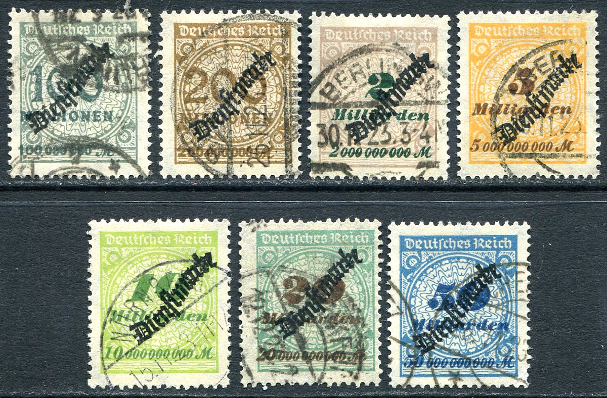 A complete set of official overprints on the last hyper-inflation set, with denominations from 100 million to 50 billion marks! Despite their good appearance, this issue is notorious for forged overprints and/or cancels. Without certificates, use your expertise and judgment as this lot is sold "as-is". 2024 Scott US$982.50 =