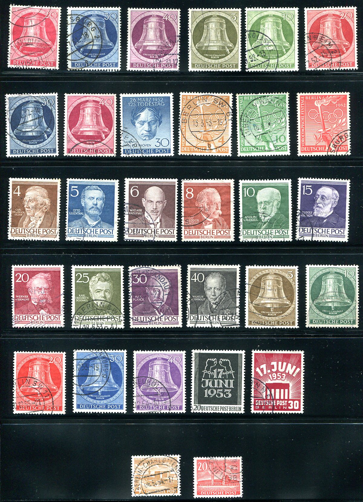 Beautiful and complete stretch of used Berlin issues from the 1949 UPU issue to the 1953 "Exhibition Halls" with a number of notable Germans (e.g. Goethe, Beethoven, Lortzing), the Olympics and three sets of "Bells". Nice cancels, and no visible faults. 2024 Scott US$814.60 =