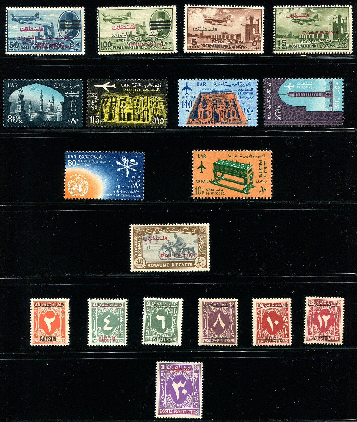 Complete mint "back of the book", Egyptian issues for use in Palestine. Includes all 38 airmail stamps, with all three King Farouk issues including the obliteration of the King’s face and the later re-overprinting. The only Special Delivery stamp is here along with the set of 7 postage due issues. Lovely appearance and condition. All are hinged, most lightly. 2024 Scott US$446.55 =