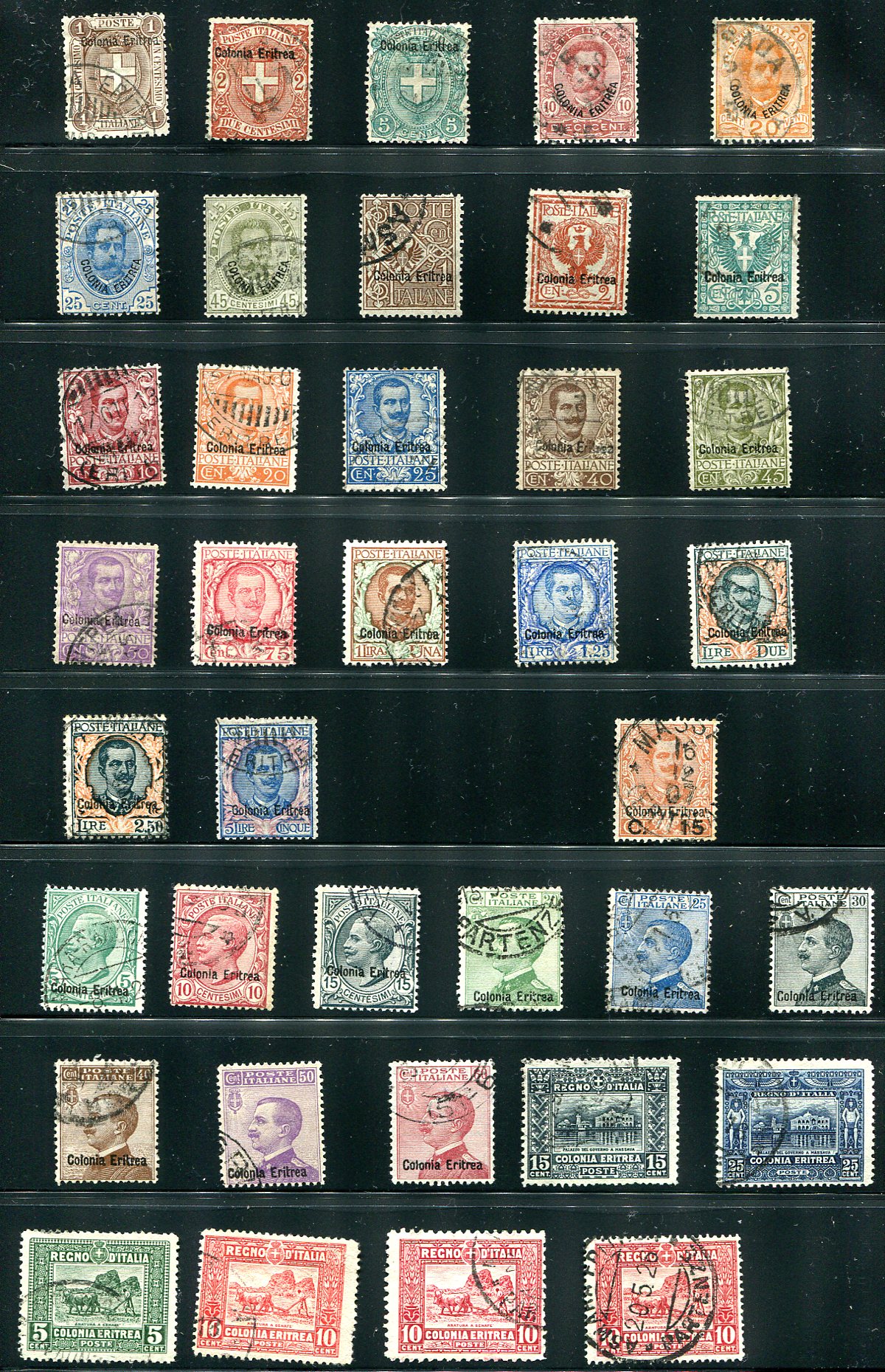 A page and a half of very clean used early 20th century issues, from its time as an Italian Africa colony. A couple of the better values have owner’s markings on the back. A very difficult group to assemble, and these are in better condition than normally seen. 2024 Scott US$744.40 =