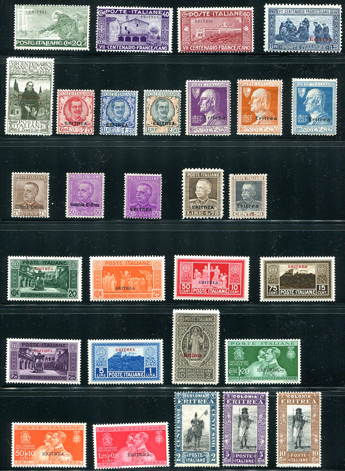In only 5 years between 1926-1930, Eritrea had almost 50 "regular issue" stamps, most being overprinted Italian issues. This complete mint run includes all the better (#99-101, #106-107, #107A). All hinged, many quite lightly. 2024 Scott US$896.25 =