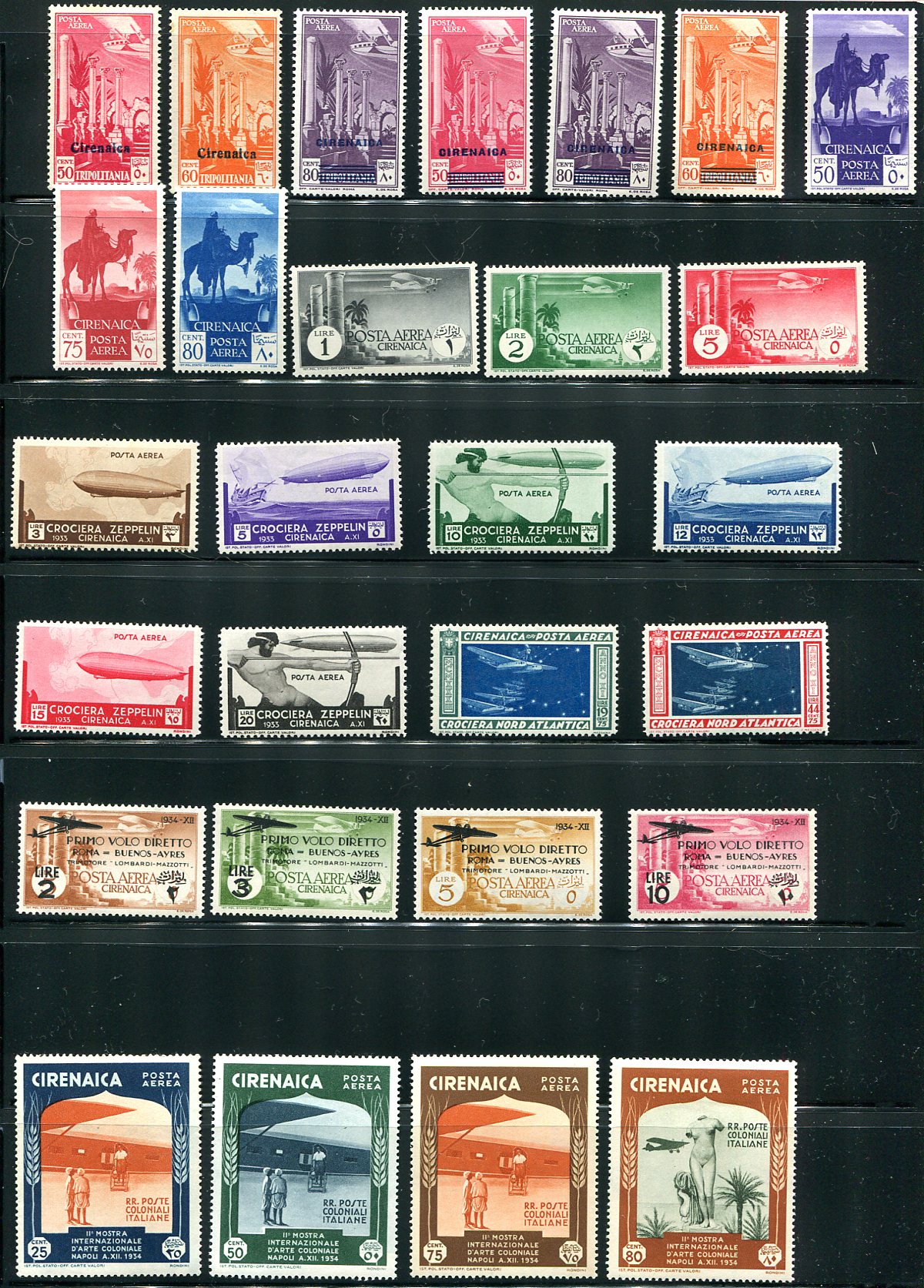 Complete mint airmail (including semi-postal airmail) from this former Italian North Africa colony, now part of Libya. Many are overprints on Italian stamps or colonial "Common Design" issues. Most have the lightest of hinging. Includes the 60c "Postmaster Provisional", listed as a Scott footnote. Lovely material. 2024 Scott US$334.20 =
