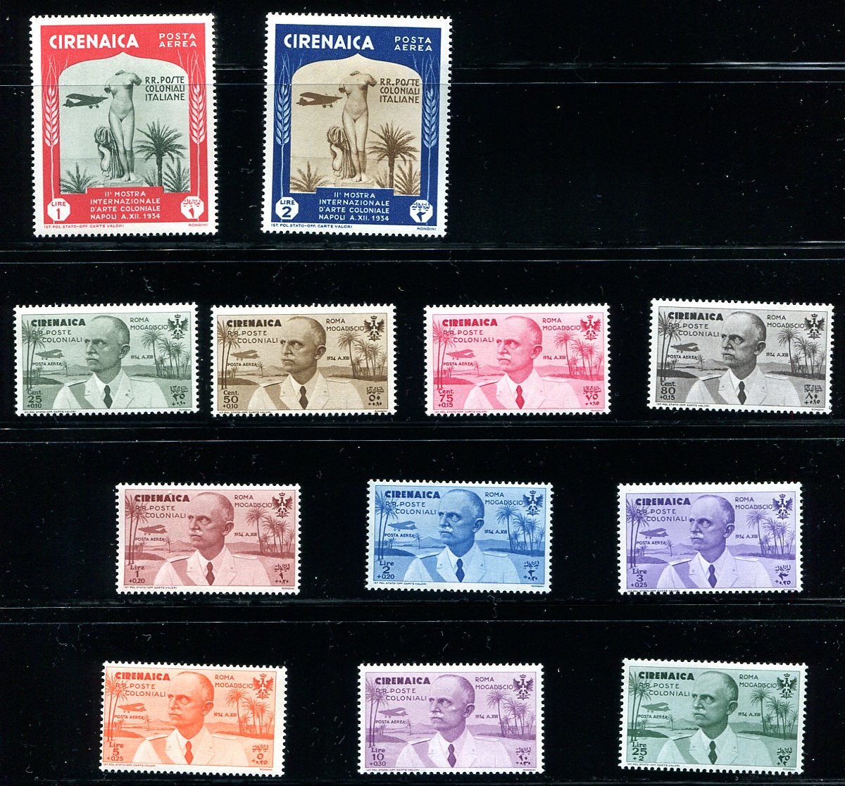 Complete mint airmail (including semi-postal airmail) from this former Italian North Africa colony, now part of Libya. Many are overprints on Italian stamps or colonial "Common Design" issues. Most have the lightest of hinging. Includes the 60c "Postmaster Provisional", listed as a Scott footnote. Lovely material. 2024 Scott US$334.20 =