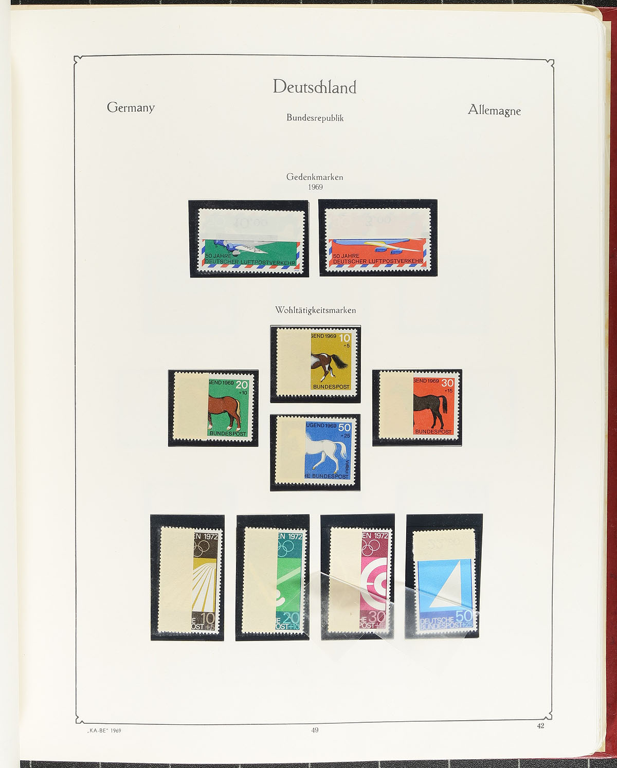 Lovely collection of 1947-1982 issues, mixed mint and used early issues with some choice key used semi-postal sets and mostly mint (#664a) from 1957 onward with all mint stamps in the collection never hinged (except for a couple on the first page). Mounted on vintage mostly "KA-BE" pages and many from with attached sheet margin folded forward. Includes Michel-listed varieties on Postal Tax issues, and the overall Scott catalogue value is likely to top US$2000.00. A total of 1225 stamps and 23 S/S. Estimate =