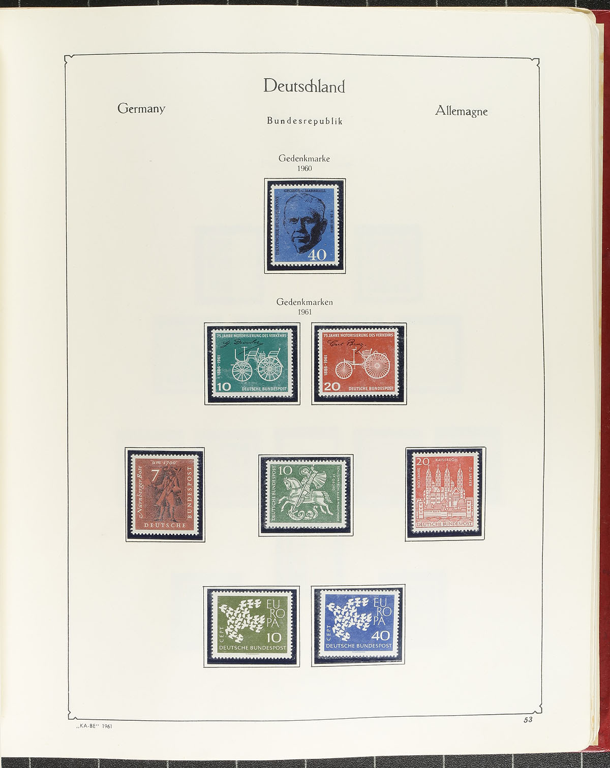 Lovely collection of 1947-1982 issues, mixed mint and used early issues with some choice key used semi-postal sets and mostly mint (#664a) from 1957 onward with all mint stamps in the collection never hinged (except for a couple on the first page). Mounted on vintage mostly "KA-BE" pages and many from with attached sheet margin folded forward. Includes Michel-listed varieties on Postal Tax issues, and the overall Scott catalogue value is likely to top US$2000.00. A total of 1225 stamps and 23 S/S. Estimate =
