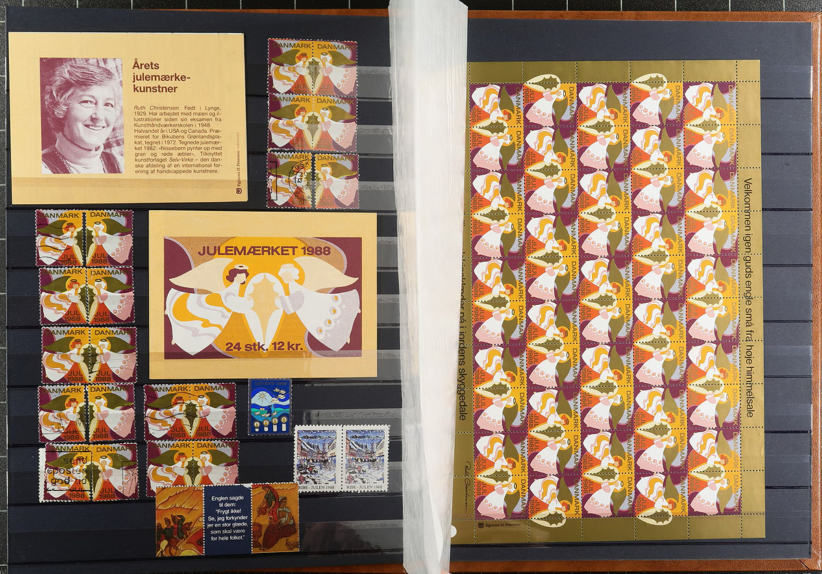 Phenomenal collection of Christmas Seals in 3 matching brown Uni-Safe 16-page stockbooks. Includes regular issues from 1904 to 2010 (complete!) plus other private Danish Christmas Seals, booklets, commercial covers with seals, complete panes, early imperfs and mint Christmas issue souvenir sheets from 2009-2010. 2012 AFA Nordisk Julemaerkerkatalog DKK12187.00 in Canadian Dollars =