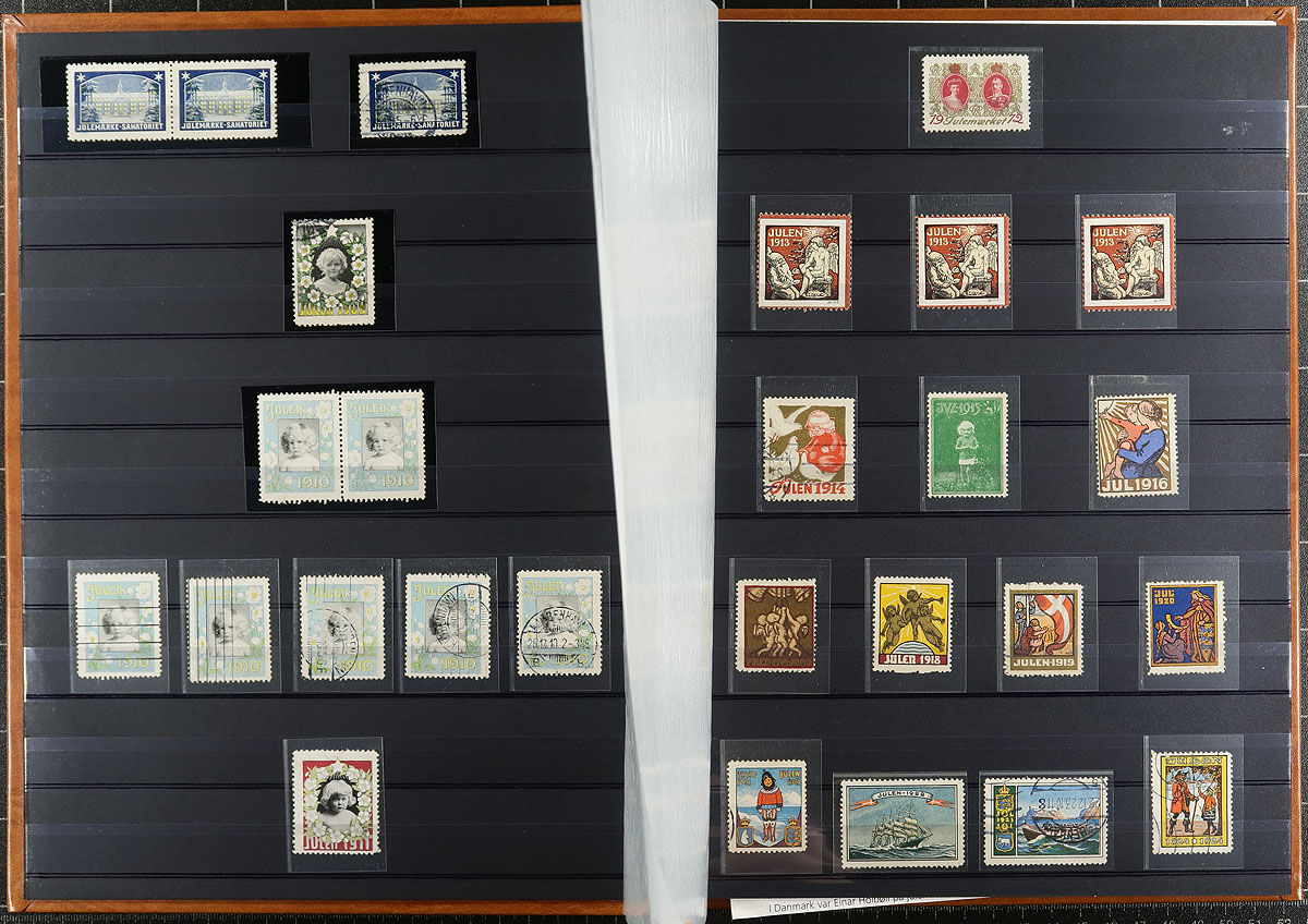 Phenomenal collection of Christmas Seals in 3 matching brown Uni-Safe 16-page stockbooks. Includes regular issues from 1904 to 2010 (complete!) plus other private Danish Christmas Seals, booklets, commercial covers with seals, complete panes, early imperfs and mint Christmas issue souvenir sheets from 2009-2010. 2012 AFA Nordisk Julemaerkerkatalog DKK12187.00 in Canadian Dollars =