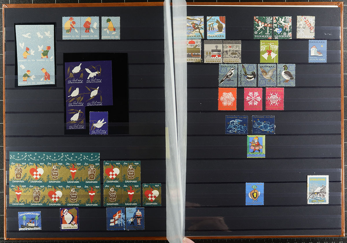 Phenomenal collection of Christmas Seals in 3 matching brown Uni-Safe 16-page stockbooks. Includes regular issues from 1904 to 2010 (complete!) plus other private Danish Christmas Seals, booklets, commercial covers with seals, complete panes, early imperfs and mint Christmas issue souvenir sheets from 2009-2010. 2012 AFA Nordisk Julemaerkerkatalog DKK12187.00 in Canadian Dollars =