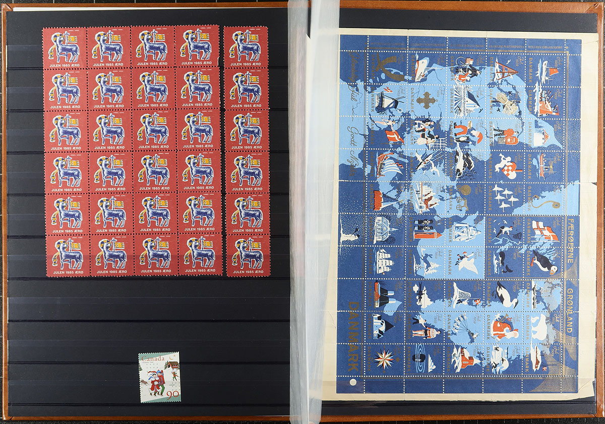 Phenomenal collection of Christmas Seals in 3 matching brown Uni-Safe 16-page stockbooks. Includes regular issues from 1904 to 2010 (complete!) plus other private Danish Christmas Seals, booklets, commercial covers with seals, complete panes, early imperfs and mint Christmas issue souvenir sheets from 2009-2010. 2012 AFA Nordisk Julemaerkerkatalog DKK12187.00 in Canadian Dollars =