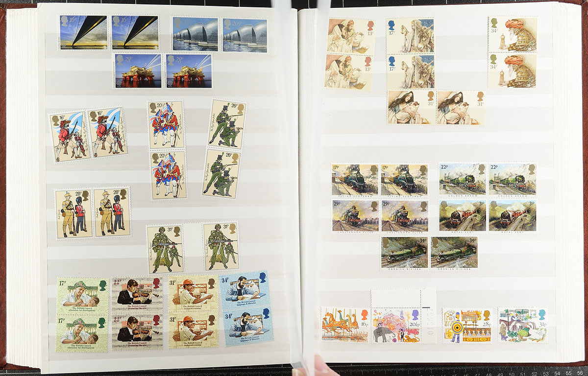 Decimal-era mint, never hinged, commemorative and Christmas selection up to 1999. Includes many complete sets, se-tenant strips, but no souvenir sheets (and no Machins). All neatly laid out in a light (and near-new) brown "Clearview" 64-page stockbook. Includes some 1st and 2nd class material. Over 1,000 stamps, with the lightest of duplication (mostly pairs until 1985). Great to build your modern GB collection, or to break up for postage. The estimated face value is £300.00 = $552.00 CDN. Estimate =